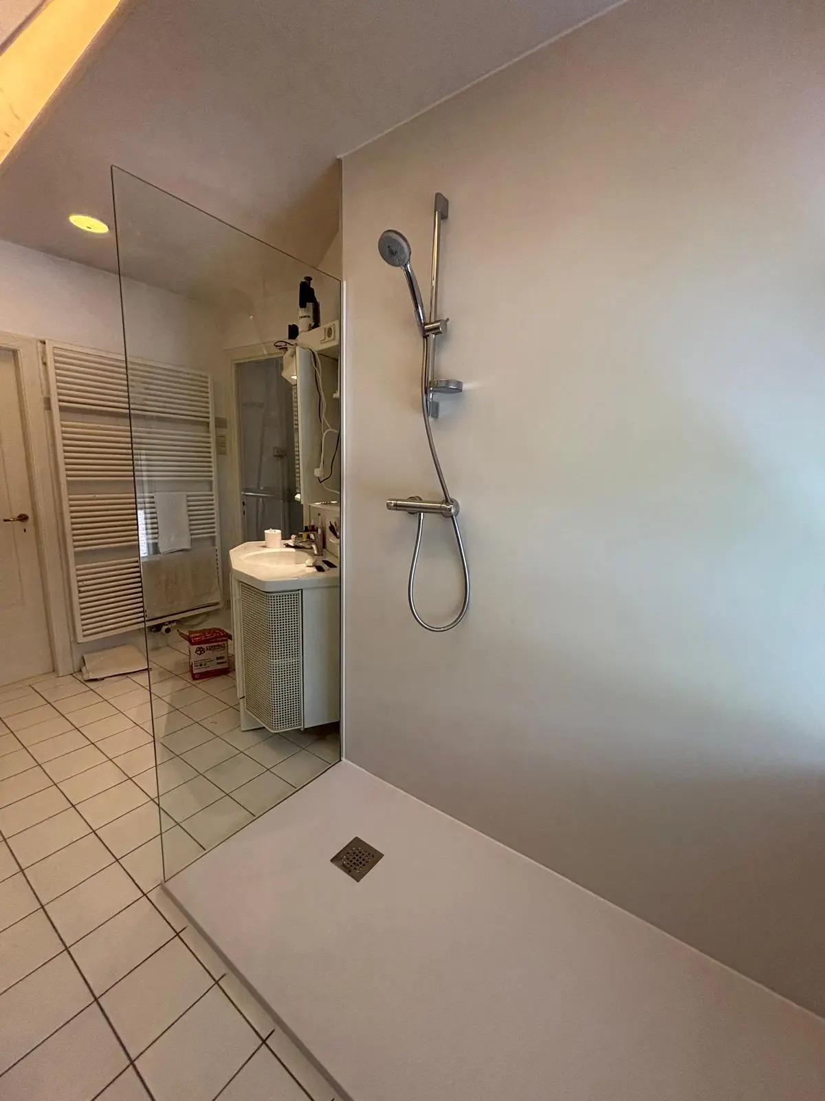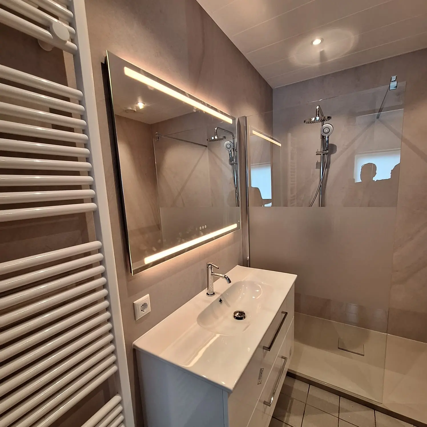 Minder voegen, meer symmetrie. Wij betegelen uw badkamer volledig, tot in het plafond als u dat wenst, strak afgewerkt of juist met mozaiek-nisjes.